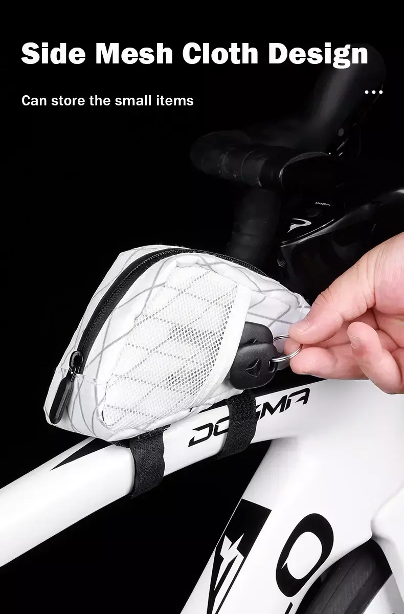 Fabricada con tejido impermeable de alto rendimiento, esta bolsa mantiene tus objetos protegidos del polvo, la lluvia y el barro. Ideal para guardar tu teléfono, herramientas, cartera o incluso un snack para el camino. Gracias a su diseño triangular, se ajusta perfectamente al cuadro de la bicicleta sin interferir con el pedaleo ni afectar la aerodinámica.